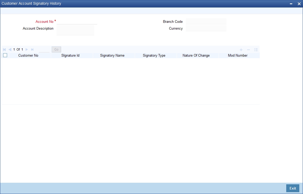 Select the account number for which you want to view the signature history details, from the adjoining option list. The list displays all valid accounts maintained in the system.