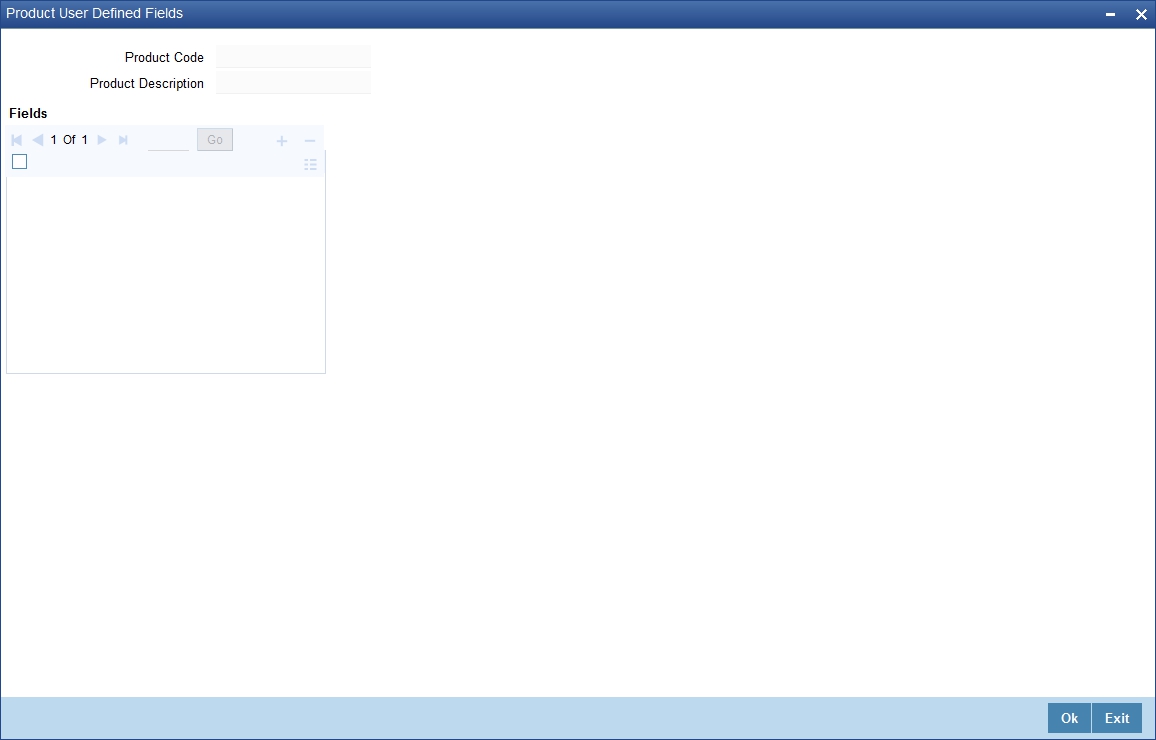You can select the product for which the user defined field details are being maintained. The user defined field details will be validated only for transactions involving the product selected in this field. The description for the product code will be displayed on selection of the product code.
