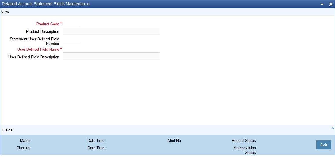 In the Detailed Account Statement Fields Maintenance screen, you can specify a list of user defined fields applicable for a product that you have created. Each list can be identified by an UDF name and description.