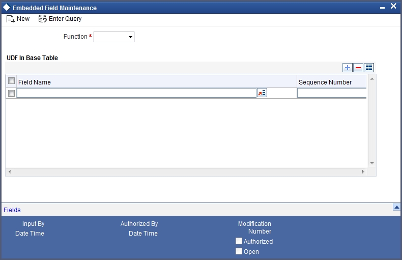 If the new field that is being defined is for a maintenance screen (Usage Allowed is ‘Function Id’), you can specify the function Id of the screen in which the new field has to be used. This has to be indicated in the ‘Function Id’ field. Click on the option list positioned next to this field. The function Ids of all the maintenance screens will be displayed. Select the appropriate function Id.