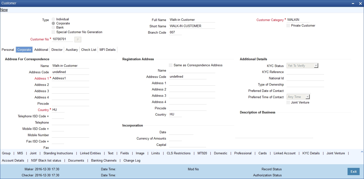 On occasions, to know your customer better, you may need to capture additional information about the customer. This is in addition to the regular information that you would capture in the Customer Information Maintenance screen. You can do so by defining a set of UDFs and associating them with the function id ‘STDCIF’ (for Customer Information Maintenance screen). On association, the UDFs will be available in the screen and you can enter the values for the same. The values will be verified for adherence to the validation rules maintained for the UDFs.