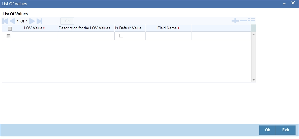 Click ‘LOV’ button and define the list of values and their description. The items that you define for the list are displayed whenever the field is used in Oracle FLEXCUBE.