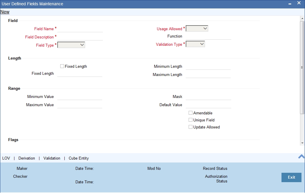 For instance, you may want to capture the ‘Personal Identification Number’ for all individual customers of your bank. To achieve this, you need to define ‘Personal Identification Number’ as an UDF in the User Defined Fields screen. You can also write a code to validate the entry into this field.