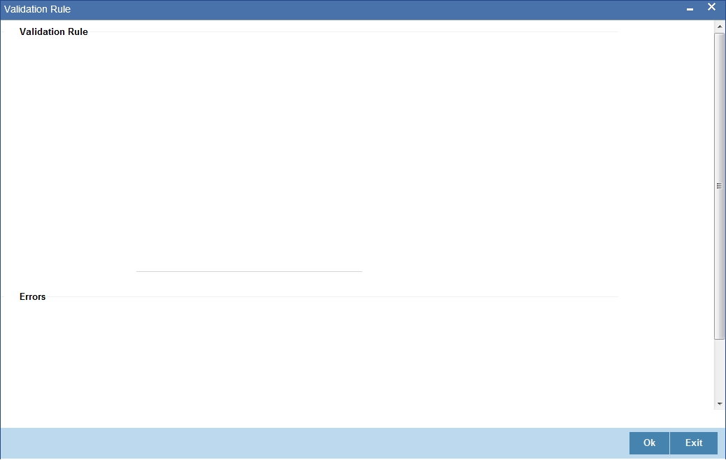 After writing the PL/SQL code, click ‘X’ button to execute the code. The derivation code will be validated by the system. If any checks fail, you must alter the statement so that the validation can be made successfully. Click ‘E’ button to view the errors.