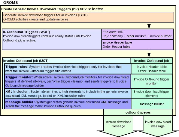 1. Creates invoice download triggers, based on Order Management System activities that create an invoice. See Invoice Outbound Trigger Activities for a list of the activities that create invoice download triggers.