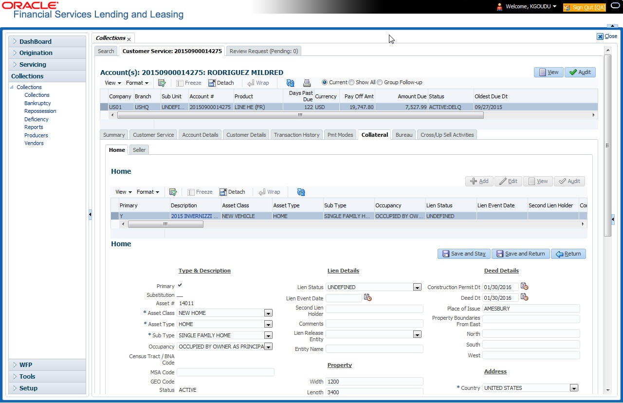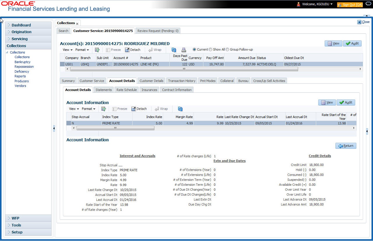 After an application has cycled through the Line of credit origination process, it becomes an account. Account maintenance and collections tasks can be performed with Oracle Financial Services Lending and Leasing’s Collection screen.