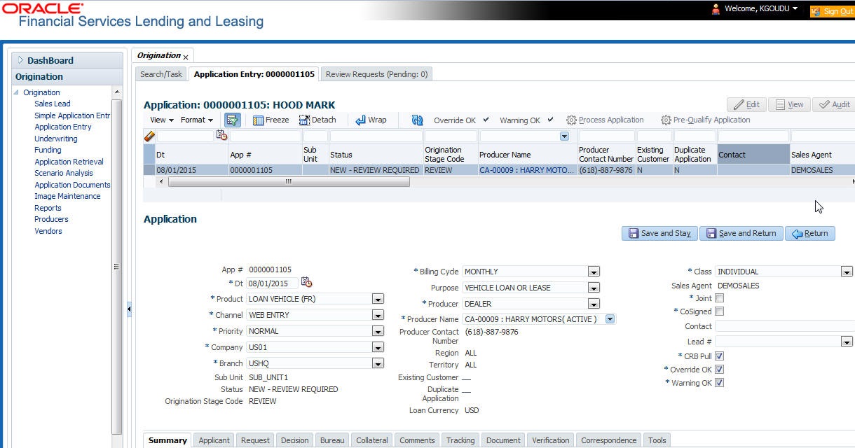 The first step in the Loan origination process is entering credit application data into Oracle Financial Services Lending and Leasing Application. The Application Entry screen enables you to specify information from credit application into the system and request a credit bureau report.