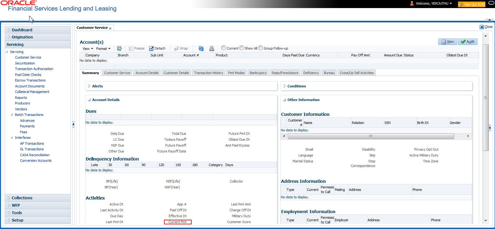 The Customer Service screen’s Maintenance sub tab enables you to post an array of monetary and nonmonetary transactions for any given account. The transactions that are available depend on responsibility of the Oracle Financial Services Lending and Leasing user, nature of account, and whether the account is a Loan.