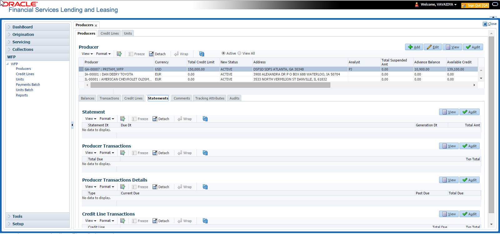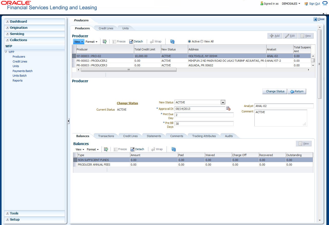 On the Oracle Financial Services Lending and Leasing home screen, click WFP > WFP > Producers > Balances