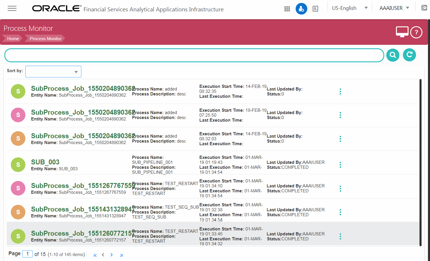 This window displays all the Workflows which are invoked from the Application with details such as Entity Name, Entity ID, Process Name, Process Description, Execution Start Time, Last Execution Time, Last Updated By and Status.