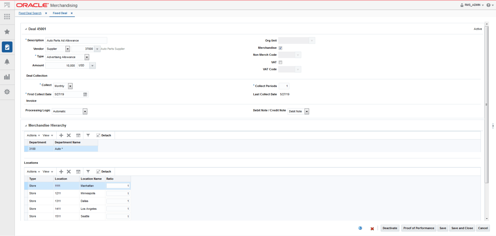 After a deal has been successfully negotiated, it needs to be defined within Merchandising in order to have discounts on purchase orders applied or in order to recover rebates from the supplier. This deal definition is carried out in terms of its components, which include the following: item/locations, thresholds, discounts and funding percentages. Once this setup is complete, the deal can be approved.
