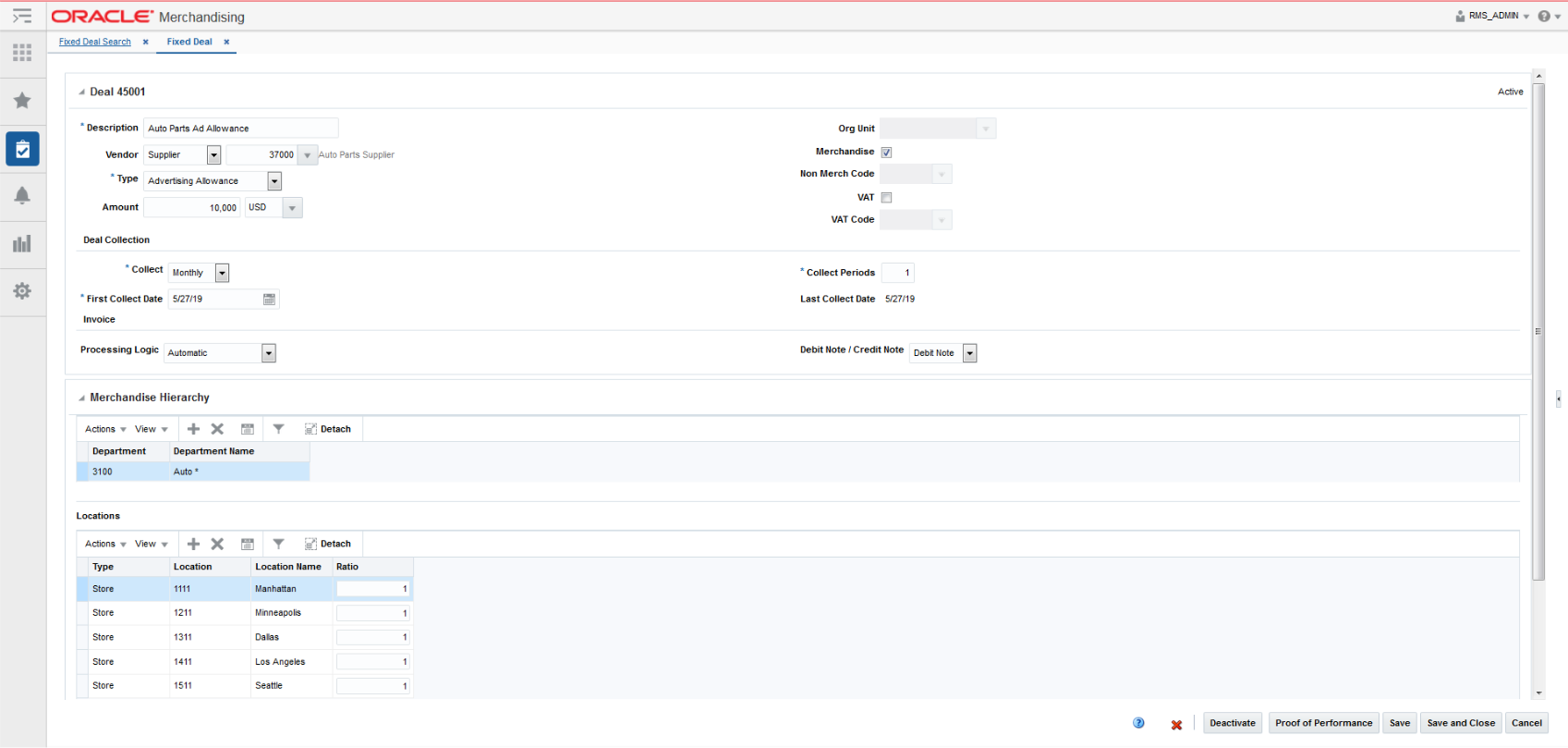 After a deal has been successfully negotiated, it needs to be defined within Merchandising in order to have discounts on purchase orders applied or in order to recover rebates from the supplier. This deal definition is carried out in terms of its components, which include the following: item/locations, thresholds, discounts and funding percentages. Once this setup is complete, the deal can be approved.