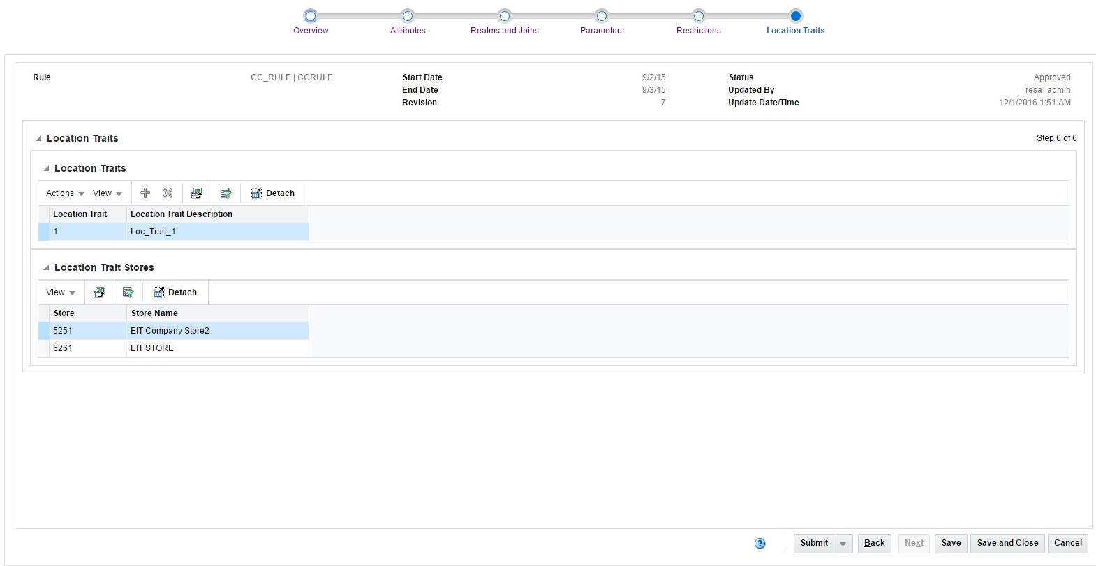 The Location Traits window allows you to associate rules with location traits which link a group of stores. Once the association is specified, the rule is applied only for those stores. If the rule is based on a total, you can execute the rule only for stores for which the total is calculated.
