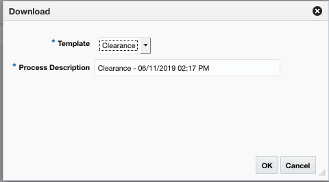 4. In the Download pop-up, select the template to use for downloading the clearance groups. This will automatically generate a process description for the download, which you can update if desired.