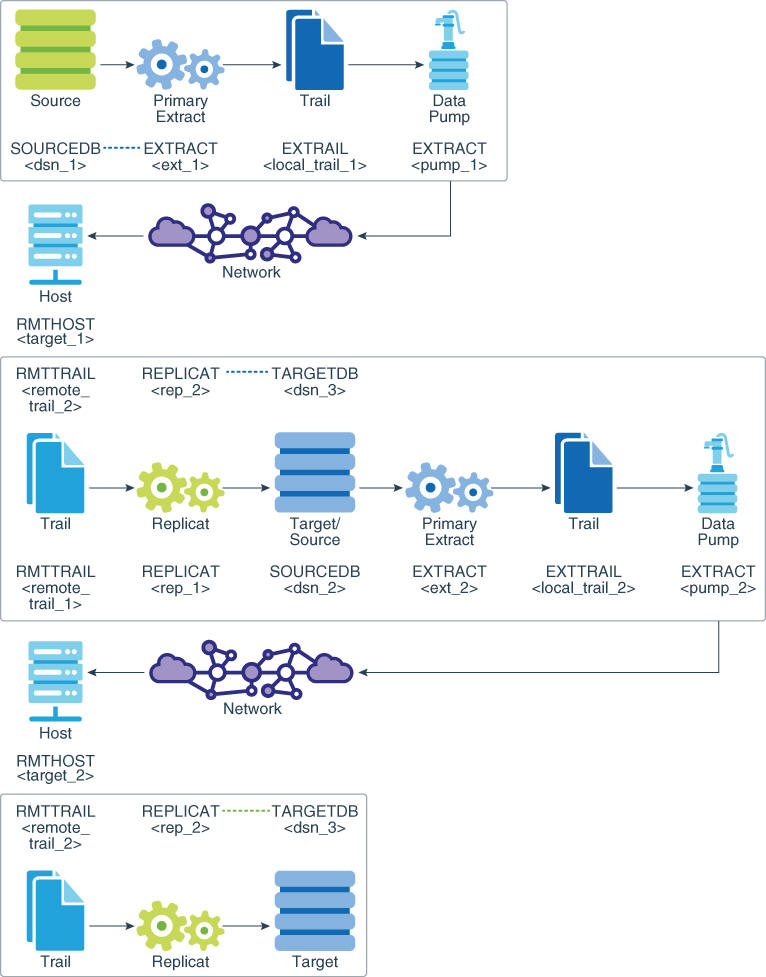 データ・ポンプは、データをカスケード内の3番目のシステムにあるリモート証跡に送信し、そのデータは別のReplicatによってローカル・データベースに適用されます。