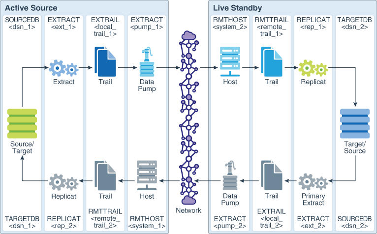 Oracle GoldenGateクラシックのドキュメント Oracle GoldenGateビジネス・ソリューション ライブ・スタンバイ・データベース管理のためのOracle GoldenGateの構成 ライブ・スタンバイ構成の作成 ライブ・スタンバイ構成の作成 作成するオブジェクトのビジュアル表現の詳細は、**INTERNAL XREF ERROR**を参照してください。 図10-7 ライブ・スタンバイのOracle GoldenGate構成要素「図10-7 ライブ・スタンバイのOracle GoldenGate構成要素」の説明