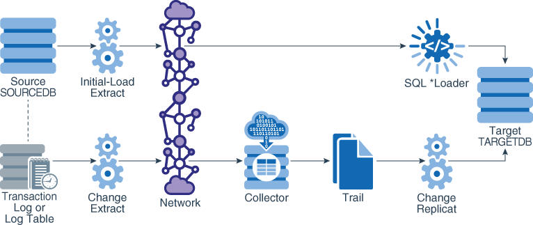 Oracle SQL*Loaderユーティリティを使用してターゲット・データを構築するには、Oracle GoldenGateの初期ロードExtractを実行してソース・レコードを抽出し、それらのレコードを初期ロードReplicatタスクに直接送信します。タスクは、Managerプロセスによって動的に起動されるプロセスであり、Collectorプロセスやファイルを使用する必要はありません。初期ロードReplicatタスクは、SQL*LoaderのAPIとのインタフェースになり、ダイレクト・パス・バルク・ロードとしてデータをロードします。データ・マッピングと変換は、初期ロードExtractまたは初期ロードReplicat、あるいはその両方で行えます。ロード中、変更同期グループは、増分変更を抽出してレプリケートします。その後、これらの変更は、ロードの結果に応じて調整されます。