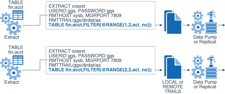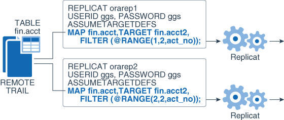 @RANGE関数を使用して、表の行を複数のOracle GoldenGateプロセスで分割できます。これを使用して大規模でアクセスの多い表のスループットを向上でき、データをセットに分割して異なる宛先に分散させることもできます。各範囲をTABLEまたはMAP文のFILTER句に指定します。