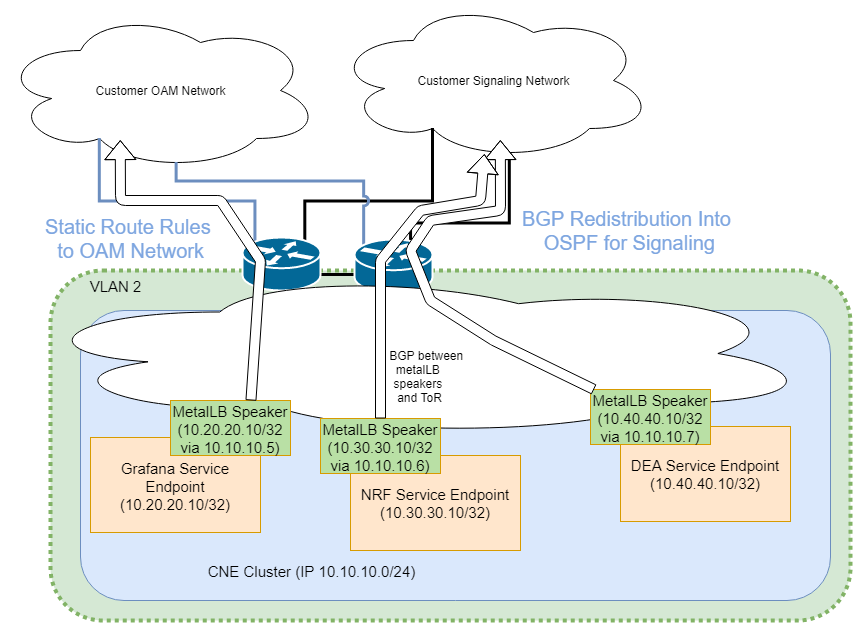 Cloud Native networks are typically flat networks, consisting of a single subnet within a cluster. The Kubernetes networking technology is natively a single network IP space for the cluster. This presents difficulty when deploying in telecom networks that still maintain a strict OAM and Signaling separation in the customer infrastructure. The OC-CNE will provide metalLB load-balancer with BGP integration to the ToR switches as a means to address this problem. Each service end-point will configure itself to use a specific pool of addresses configured within metalLB. There will be two address pools to choose from, OAM and Signaling. As each service is configured with an address from a specific address pool, BGP will share a route to that service over the cluster network. At the ToR, some method of advertising these address pools to OAM and signaling paths will be needed. OAM service endpoints will likely be addressed through static route provisioning. Signaling service endpoints will likely redistribute just one address pool (signaling) into the OSPF route tables.