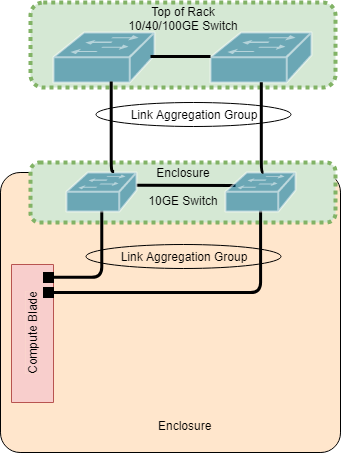 Each blade server will form a 2x10GE Link Aggregation Group (LAG) to the upstream enclosure switches. Up to 16 blades will be communicating through these enclosure switches. Without specific projected data rates, the enclosure uplinks to the Top of Rack (ToR) switches will be sized to a 4x10GE LAG each. Thus, with the switches logically grouped together, an 8x10GE LAG will be formed to the ToR.