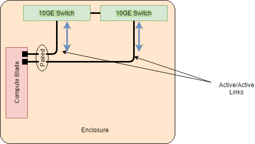 The blade server hardware will be configured with a base pair of 10GE NICs that map to Enclosure IO bays 1 and 2. IO bays 1 and 2 will be equipped with 10GE switches. The blade server OS configuration must pair the base pair of NICs in an active/active configuration.