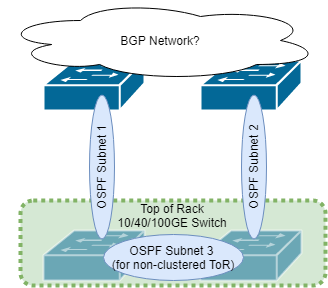 If the ToR switches are able to cluster together as one logical switch, then there is no need for an OSPF relationship between the ToR switches. In this case, they would share a common route table and have two possible routes out to the customer router interfaces. If, however, they do not cluster together as a single logical unit, then there would be an OSPF relationship between the two to share route information.