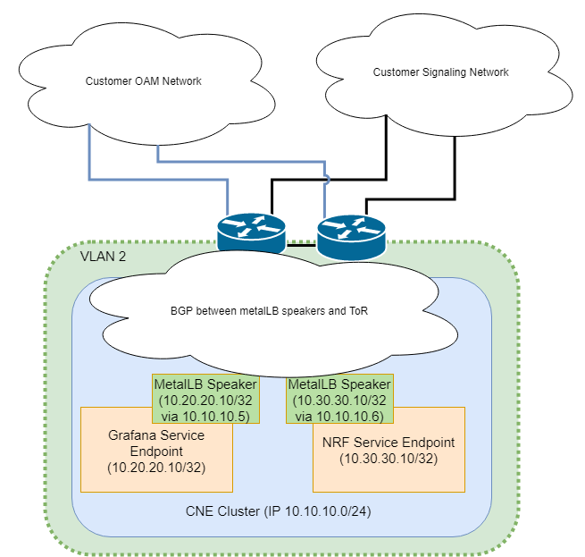 OAM type common services, such as EFK, Prometheus, and Grafana will have their service endpoints configured from the OAM address pool. Signaling services, like the 5G NFs, will have their service endpoints configured from the signaling address pool.