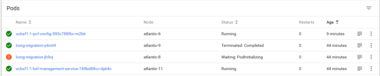 For NEF deployment, kong-migration job startup quickly for first time deployment. However, it starts so quickly before the kong-database pod is ready, few kong-migration pod may fail until kong database pod is available. For example, see Figure 3-1.