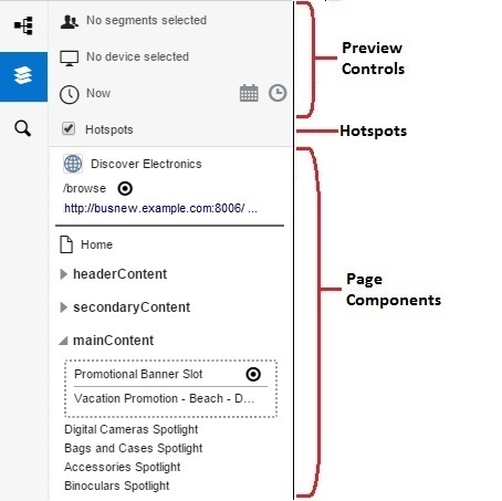 Hotspots is also in the top panel. Use this checkbox for turning on hotspots in your preview panel so that action menus appear in the slot components of your page. Hotspots aid you in auditing and editing slots.