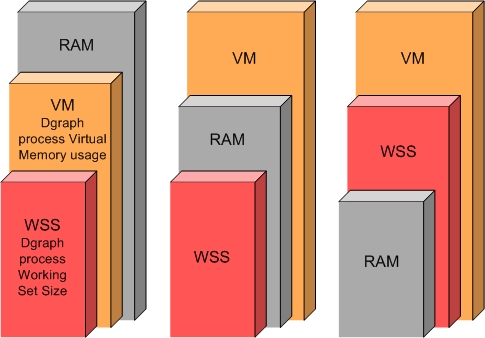 This section discusses the relationship between the amount of RAM, the Dgraph process's use of virtual memory, the Dgraph cache, the working set size (WSS), and the resident set size (RSS) for the Dgraph process and their effect on performance.