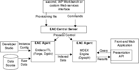Once the Agent machines in the implementation are provisioned, the developer sends commands (again using either eaccmd, Workbench, or a custom interface) to the EAC Central Server. The EAC Central Server communicates these tasks to its Agents, which reside on each machine that is running Guided Search components.