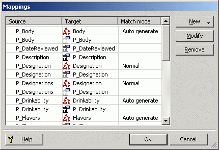 When you open the Mappings editor, it displays a table of the existing source property mappings: