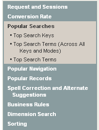 Reporting data is organized into report sections and further organized by individual report items. For example, Popular Searches and Popular Navigation are report sections. Report sections contain report items, for example the Popular Searches section contains the Top Search Keys item, among others. The following image shows the report sections available in a typical Guided Search application. It also shows the report items that display when Popular Searches is selected.