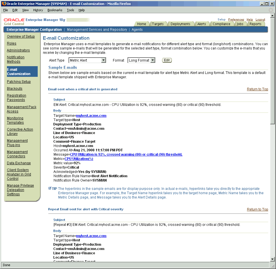 Enterprise Managerでは、スーパー管理者は、4つのアラート・タイプ(「メトリック・アラート」、「ターゲット可用性」、「ポリシー違反」、および「ジョブ・ステータスの変更」)のグローバル電子メール通知をカスタマイズできます。スーパー管理者は、シンプルなスクリプトに含まれる、事前定義された(属性とラベルと呼ばれる)構成単位を使用し、多様な情報コンテンツの中からアラートの電子メールを選択してカスタマイズできます。