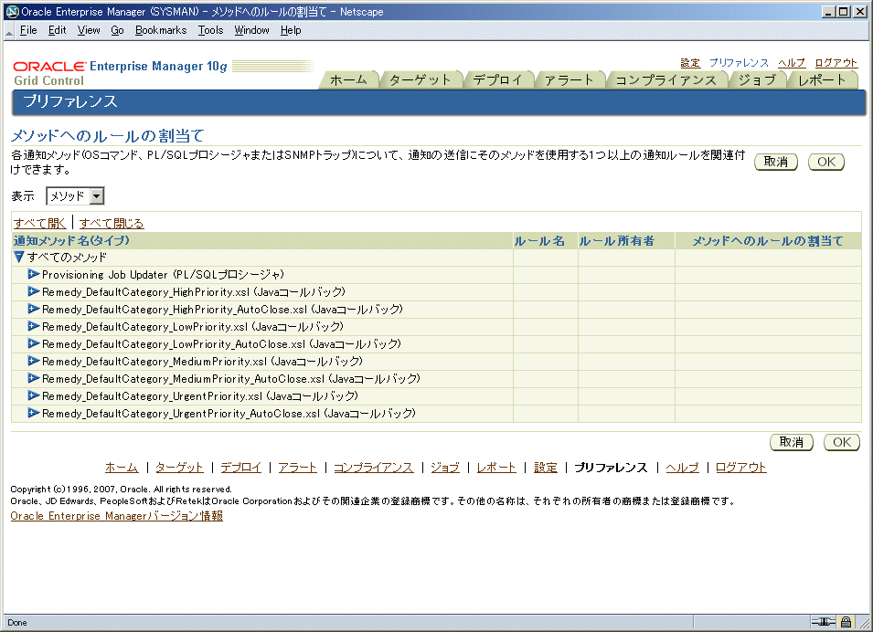 「OSコマンド」、「PL/SQL」および「SNMPトラップ」の通知メソッドを定義できるのはスーパー管理者のみです。しかし、(スーパー管理者が定義した)これらの通知メソッドの通知ルールへの追加は、すべてのEnterprise Manager管理者が実行できます。