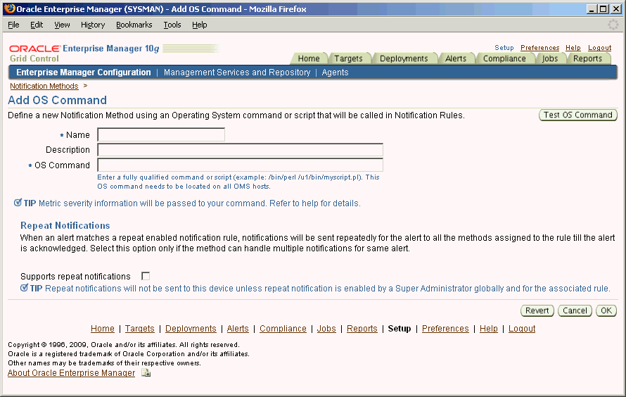 OSスクリプト、PL/SQLプロシージャまたはSNMPトラップに基づく他のカスタム通知メソッドを作成できます。すべての管理者はこれらのメソッドを通知ルールで使用できます。