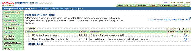 図2-1に示すように、Enterprise Manager Grid Controlコンソールの「管理コネクタ」ページに新規HP Service Managerコネクタが表示されます。