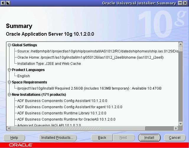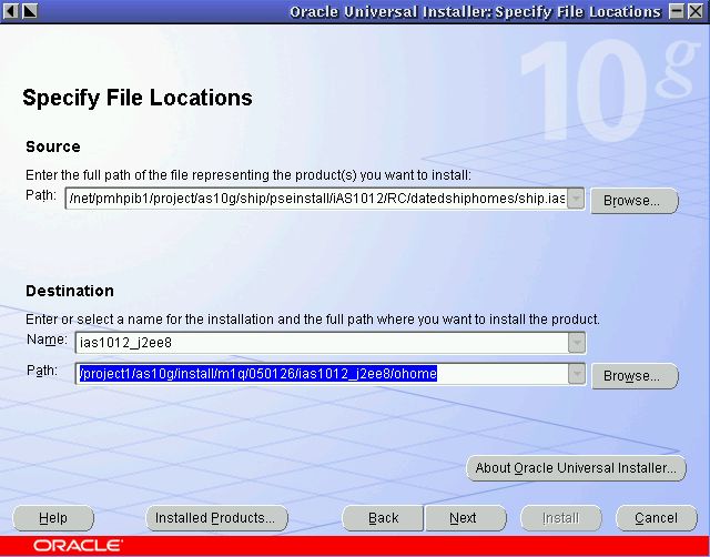 - 「インストール先」の「パス」: Oracle Application Server中間層をインストールするディレクトリへのパスを、参照して選択するか、または入力します。