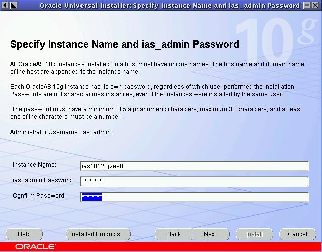 - ias_adminパスワード:およびパスワードの確認: ias_adminユーザーのパスワードを設定します。これはインスタンスの管理ユーザーです。
