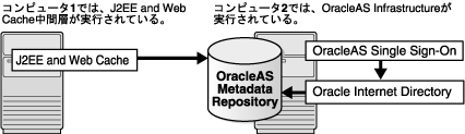 図5-1に、簡単なOracle Application Serverのインストールを示します。コンピュータ1で実行されているJ2EE and Web Cache中間層は、コンピュータ2で実行されているOracleAS Infrastructureを使用します。この図は、OracleAS Metadata Repositoryと2つのID管理サービス(OracleAS Single Sign-OnおよびOracle Internet Directory)を示しています。