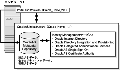 これは、OracleAS InfrastructureとPortal and Wireless中間層を含む、1台のコンピュータからなる開発トポロジです。OracleAS Infrastructureをインストールすると、新規のOracleデータベースとOracle Internet Directoryが作成されます。