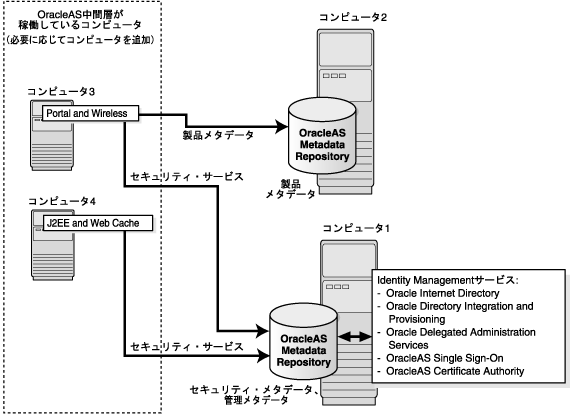 必要に応じて、Oracle Application Serverの中間層を他のコンピュータにもインストールできます。これらの中間層がどちらかのメタデータ・リポジトリを使用するように設定します。