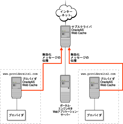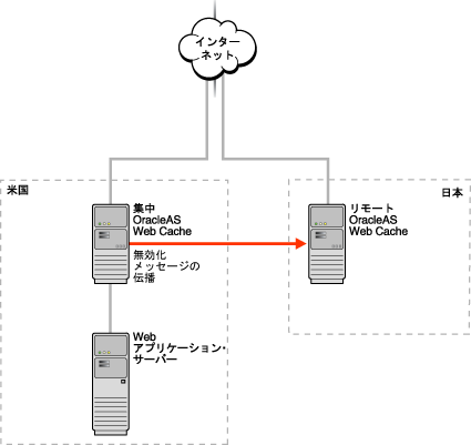 OracleAS Web Cacheサーバーから別サーバーへの無効化メッセージの伝播は次のような配置において行われます。