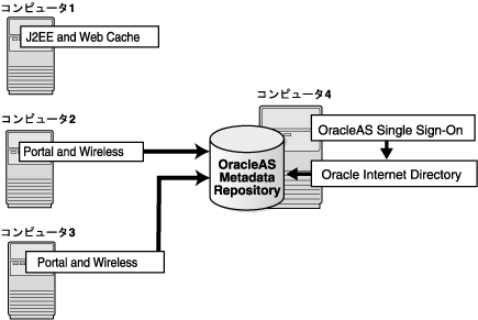 図5-1に、簡単なOracle Application Serverのインストールを示します。コンピュータ1で実行されているJ2EE and Web Cache中間層は、コンピュータ2で実行されているOracleAS Infrastructureを使用します。この図は、OracleAS Metadata Repositoryと2つのID管理サービス(OracleAS Single Sign-OnおよびOracle Internet Directory)を示しています。