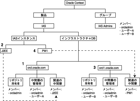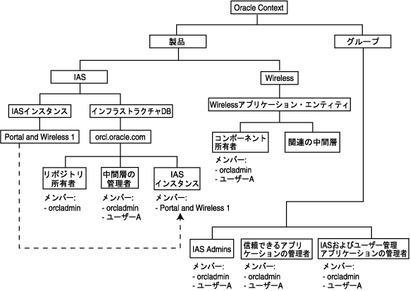図8-1に、メタデータ・リポジトリが1つ、中間層インスタンスが1つの場合のOracle Internet Directoryを示します。userAは中間層の管理者およびIAS Adminsグループに属すので、orclメタデータ・リポジトリに対して中間層をインストールできます。userAは信頼できるアプリケーションの管理者グループ、IASおよびユーザー管理アプリケーションの管理者グループおよびWirelessのコンポーネント所有者グループに属すので、中間層コンポーネントもインストールできます。