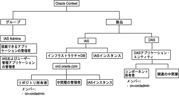 Oracle Internet Directory、OracleAS Metadata RepositoryおよびOracle Delegated Administration ServicesによってOracleAS Infrastructureをインストールする場合、Oracle Internet Directoryには次のオブジェクト(図8-6)が含まれます。