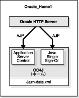 このトポロジは、前述の1.3.2項の例に類似しています。前述のとおり、このトポロジでは、Oracle HTTP ServerとOC4J中間層インスタンスが同じOracleホームに統合されますが、図1-3に示されているように、このトポロジにはApplication Server ControlおよびJava Single Sign-Onも含まれます。このトポロジは、SOAスイートの管理に適しています。