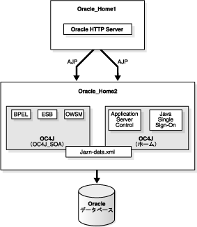 一方にOracle HTTP Serverを含み、もう一方に2つのOC4Jインスタンスを含む2つの中間層。一方のOC4JインスタンスにSOAアプリケーションが含まれ、もう一方のOC4JインスタンスにApplication Server ControlおよびJava SSOが含まれています。 |