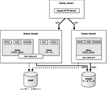 1つにOracle HTTP Serverを含み、もう1つにSOAアプリケーションがデプロイされた1つのOC4Jインスタンスを含み、最後の1つにSOAアプリケーション、Application Server ControlおよびJava SSOがデプロイされた2つのOC4Jインスタンスを含む3つの中間層。 |