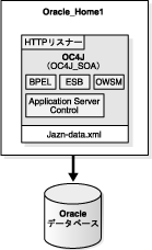 図1-4に示されているように、基本インストール・モードでは、リモートのOracleデータベースを使用してSOAスイートとOC4J中間層インスタンスが同じOracleホームに統合されます。このトポロジは、SOA開発者に適しています。